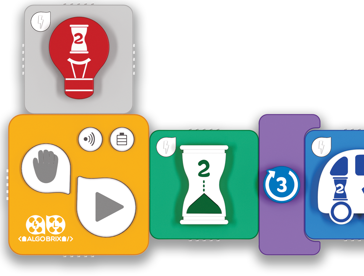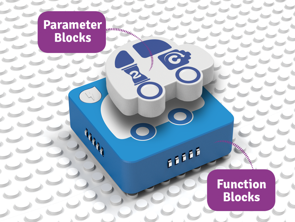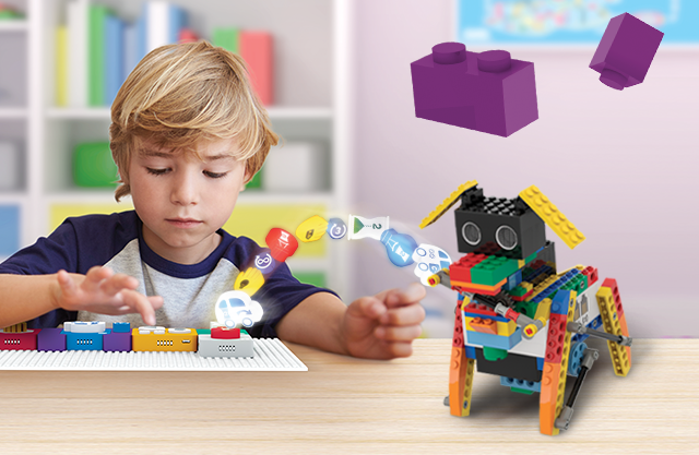 With the tangible coding language of Algobrix®, students begin by constructing a building block model, then create various code sequences using Function & Parameter blocks. Finally, by pressing the Play block, the robot will perform the coding sequence.